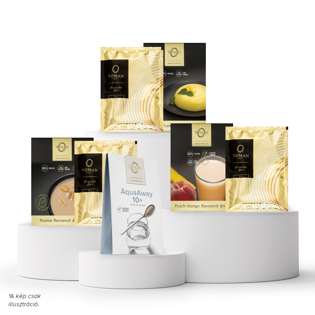 A csomagot kiegészítettük az AquaAway 10+ étrend-kiegészítő italporunkkal, ami 10 gyógynövény kivonatának és az almaecet sokoldalú hatásának köszönhetően segíthet a szervezet tisztításában, a felesleges víz és salakanyagok kiürítésével. A Toman Diet program fontos kiegészítője lehet.