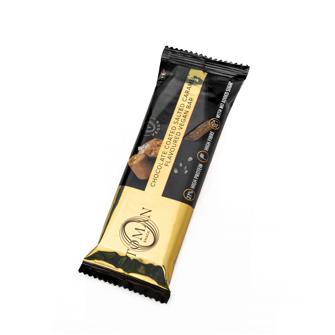 Fehérjében és élelmi rostban gazdag sós karamell ízesítésű vegán szelet csokoládé bevonattal és édesítőszerekkel.
